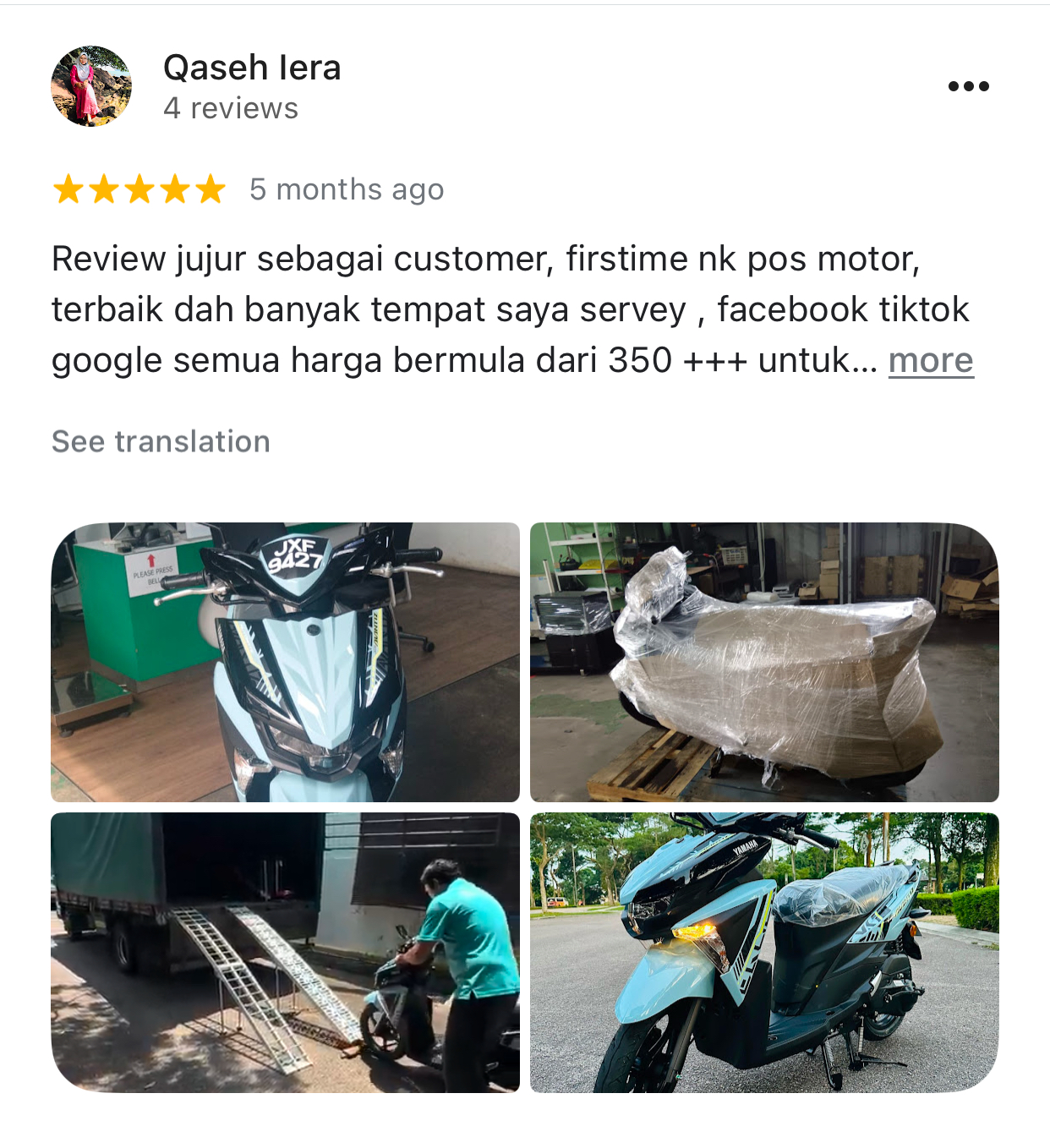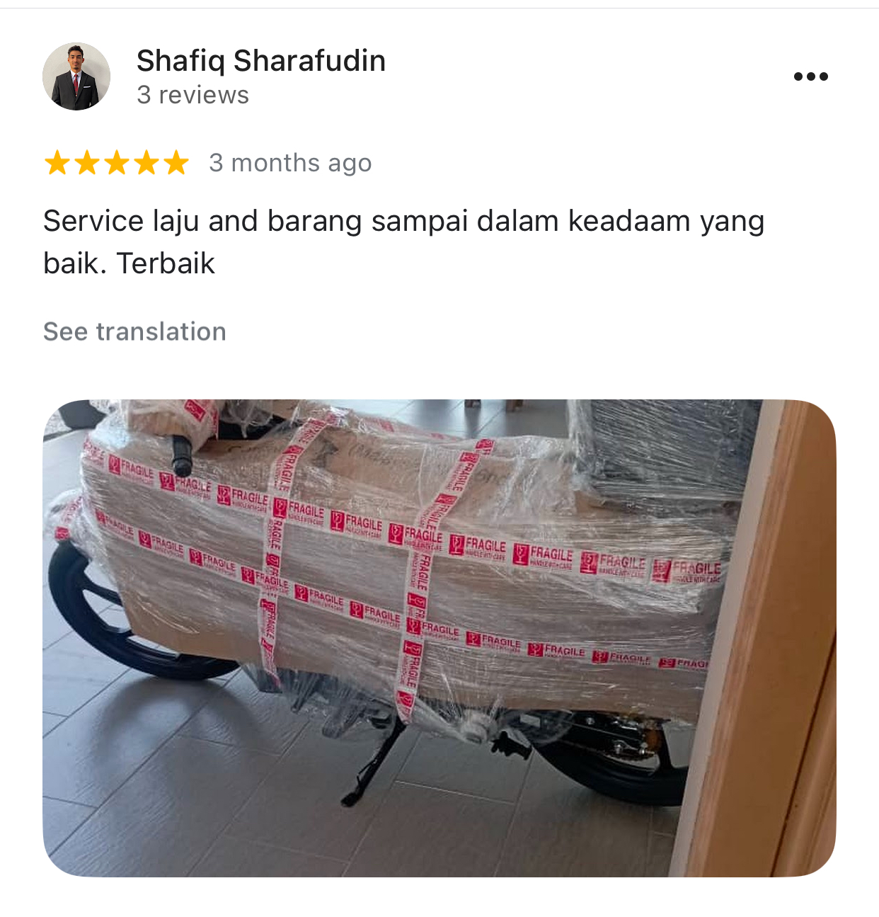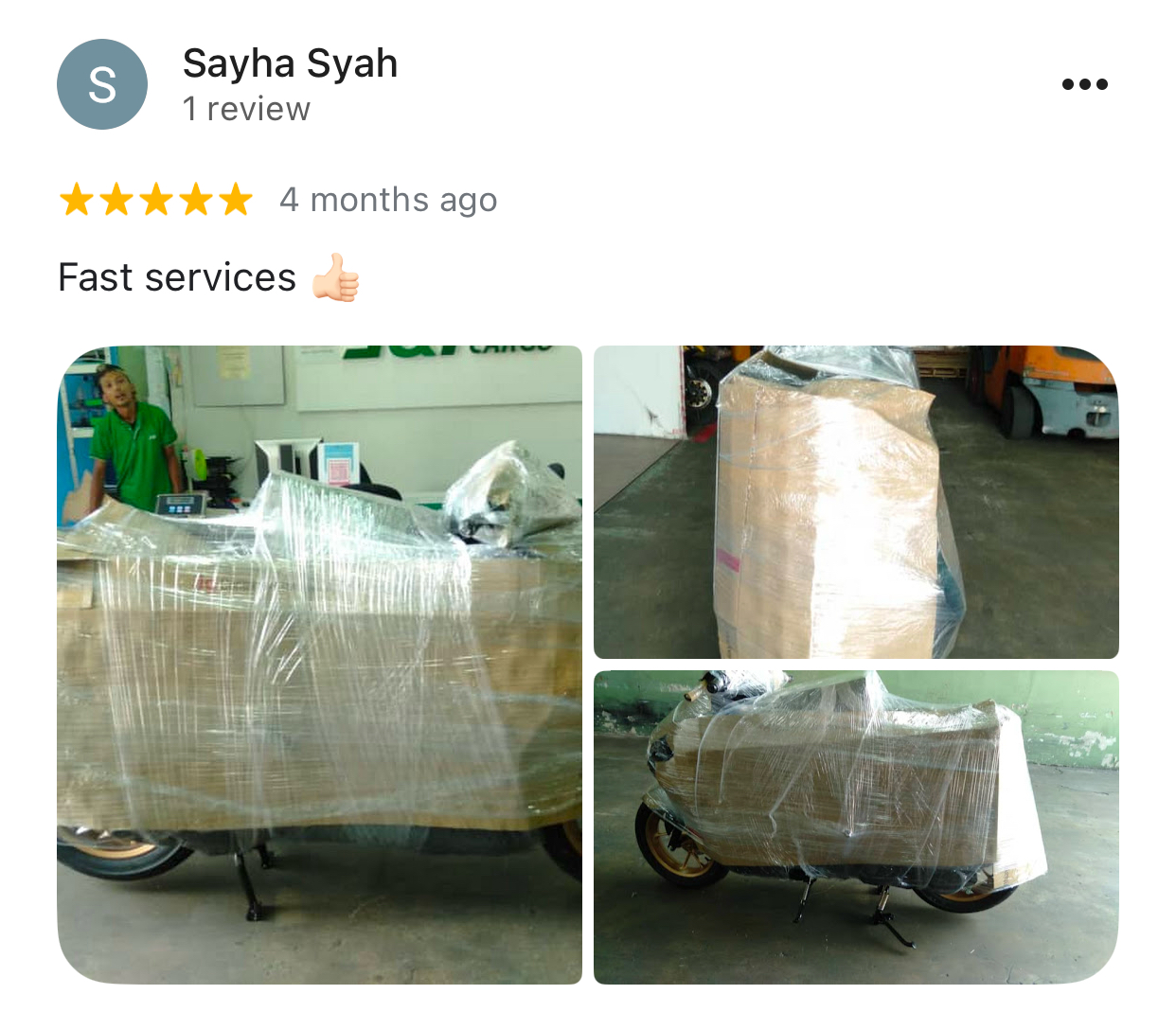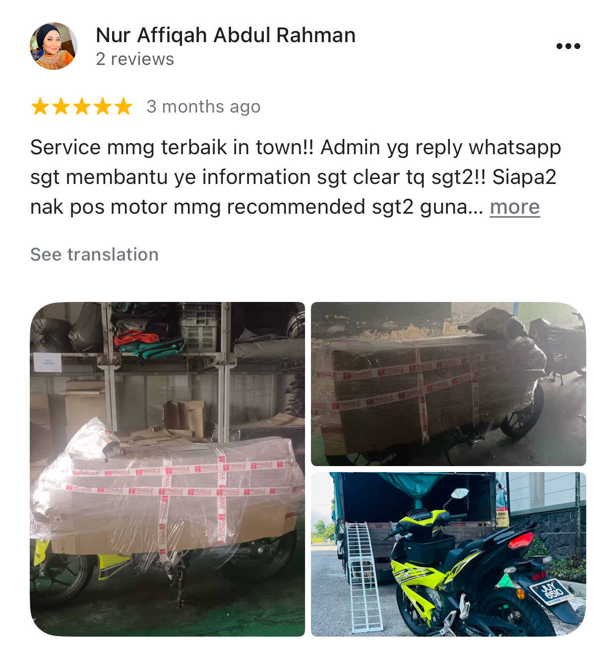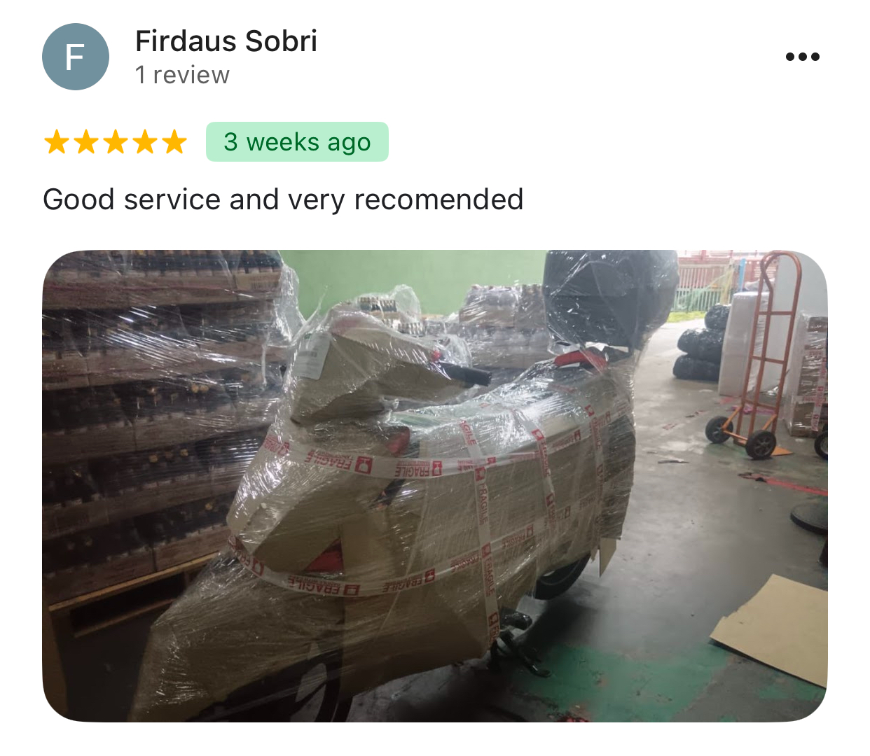 Maklum balas daripada pelanggan kami yang berpuas hati dengan perkhidmatan penghantaran motosikal dari JB ke seluruh Semenanjung Malaysia.