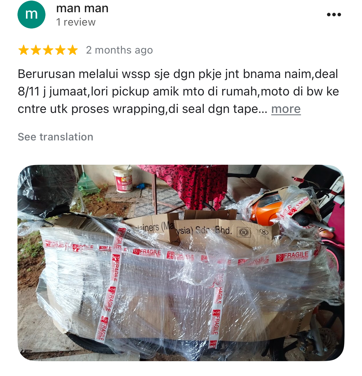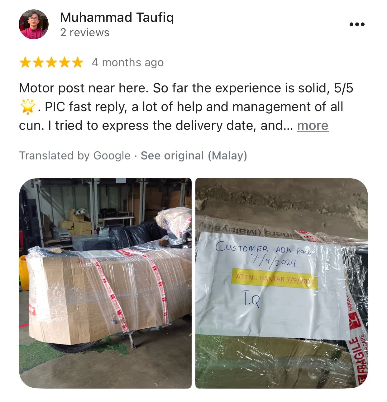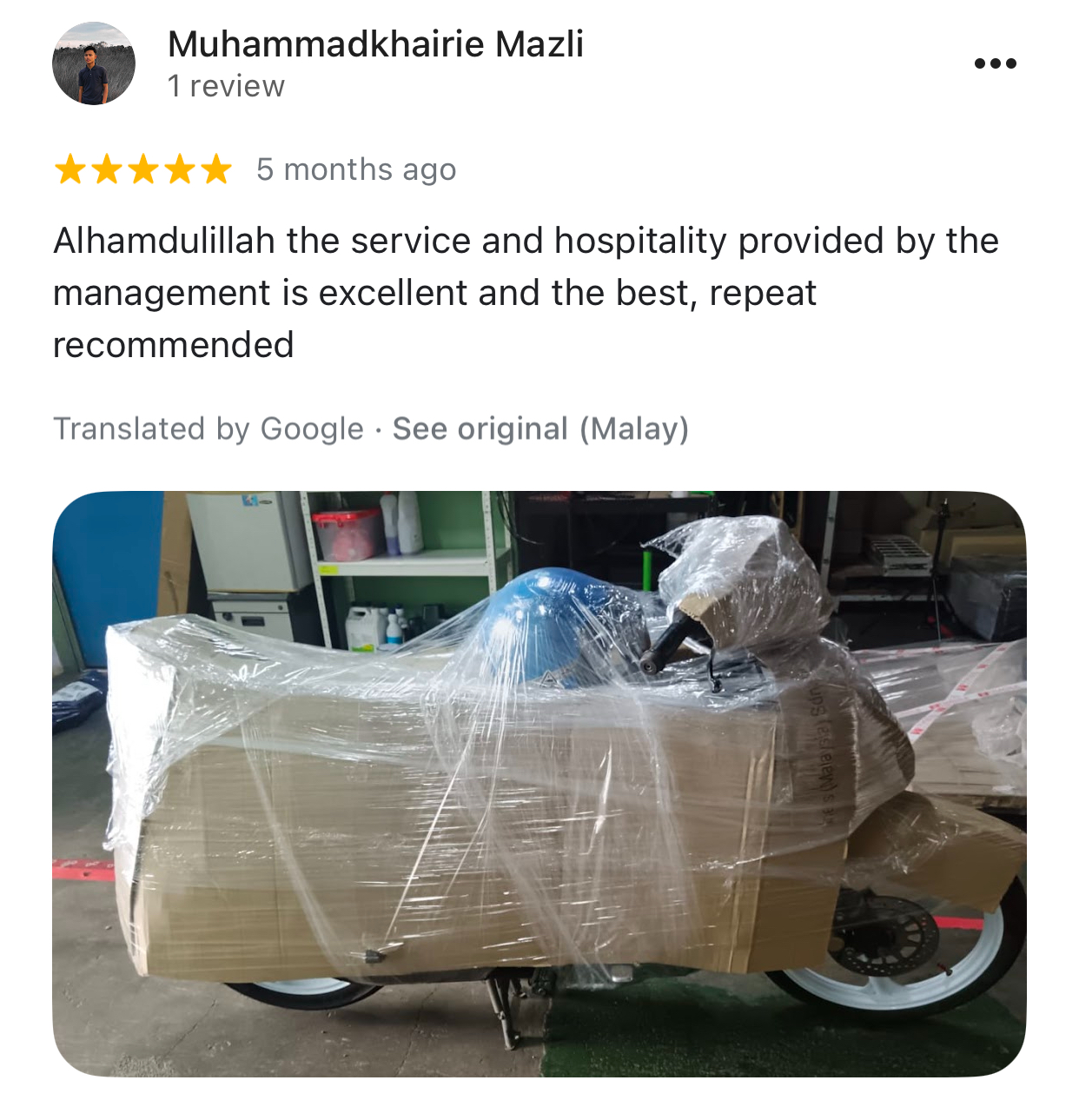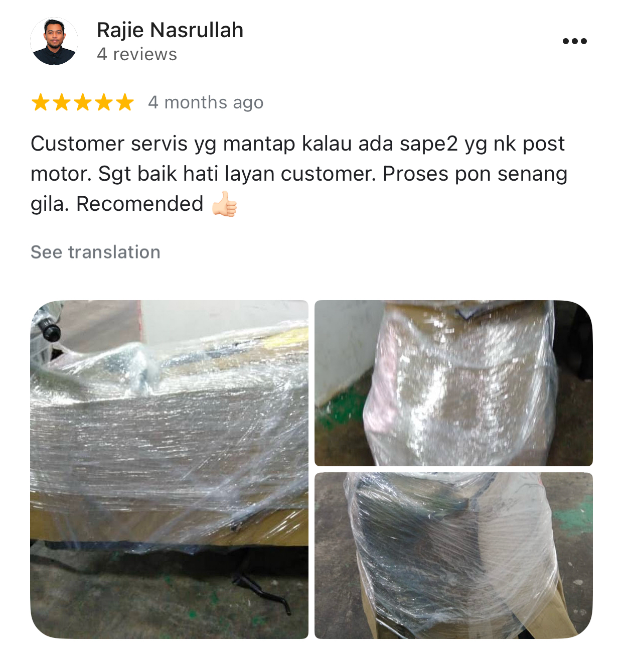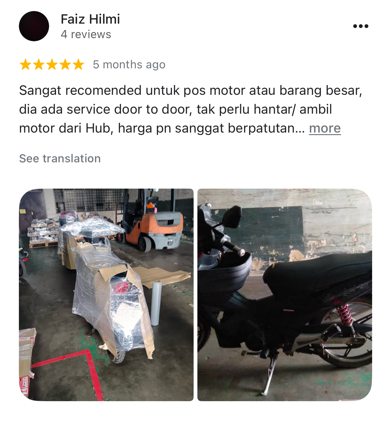 Maklum balas daripada pelanggan kami yang berpuas hati dengan perkhidmatan penghantaran motosikal dari JB ke seluruh Semenanjung Malaysia.